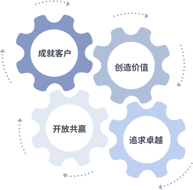 成就客户是一切决策的出发点,,创造价值是衡量所有工作的标准,,追求卓越是我们做事做人的态度,,开放共赢是我们的格局也是最终的结果。。价值观的齿轮环环相扣,,,,推动着组织里的每个人不断向前。。。。